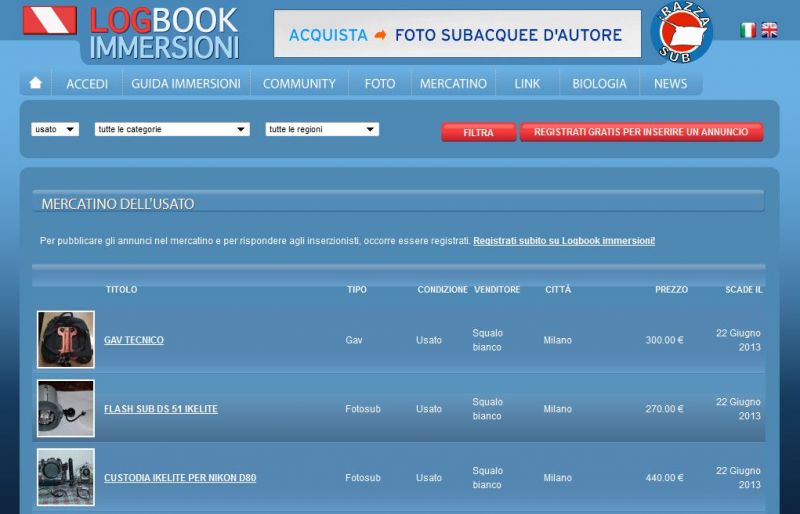 Nuova sezione sul sito, riguardante gli annunci di vendita articoli sub. Attraverso il pannello utente sarà quindi possibile pubblicare gratuitamente le offerte.